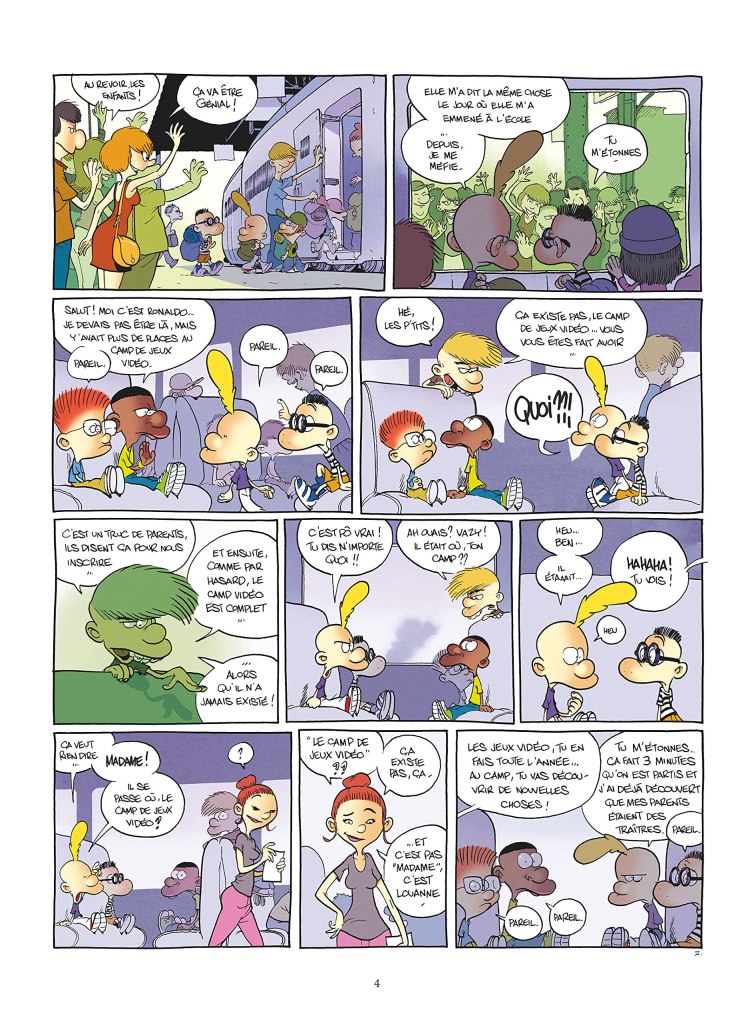 Titeuf et Manu partent en colo ! Ils auraient préféré aller au camp de jeux vidéo mais bon, il n’y avait plus de place. C’est donc pour le camp du Bois des ours qu’ils prennent le train !