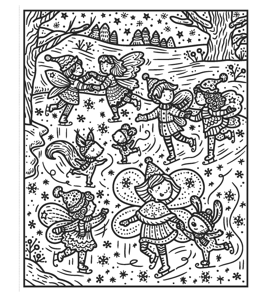 Il suffit de passer le pinceau trempé dans un peu d’eau sur les illustrations en noir et blanc pour faire apparaître les couleurs de jolies scènes hivernales.