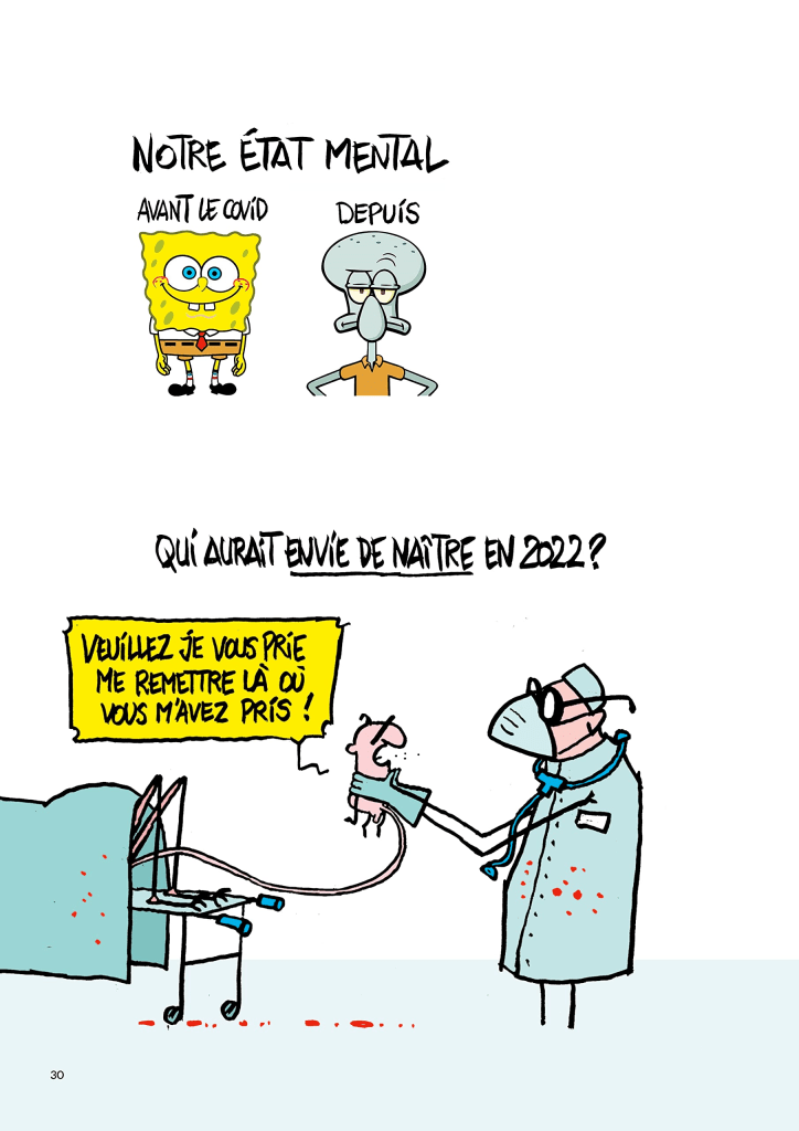 Chronique : Kanar possède un style graphique épuré immédiatement reconnaissable, qu’il s’agisse de ses personnages filiformes ou de ses collages tout aussi décapants. rien de notre actualité morose ni des travers de notre humanité n’échappe à son humour corrosif et souvent dérangeant qui ne connaît d’autre règle que de faire mouche. tantôt critique sarcastique des dérives et aux délires d’une politique aussi envahissante qu’irresponsable, dans l’esprit du dessin de presse cher à Charlie Hebdo, tantôt moraliste irrésistible de drôlerie plus proche de Mix et remix pour dépeindre les misères de l’âge et de l’époque.