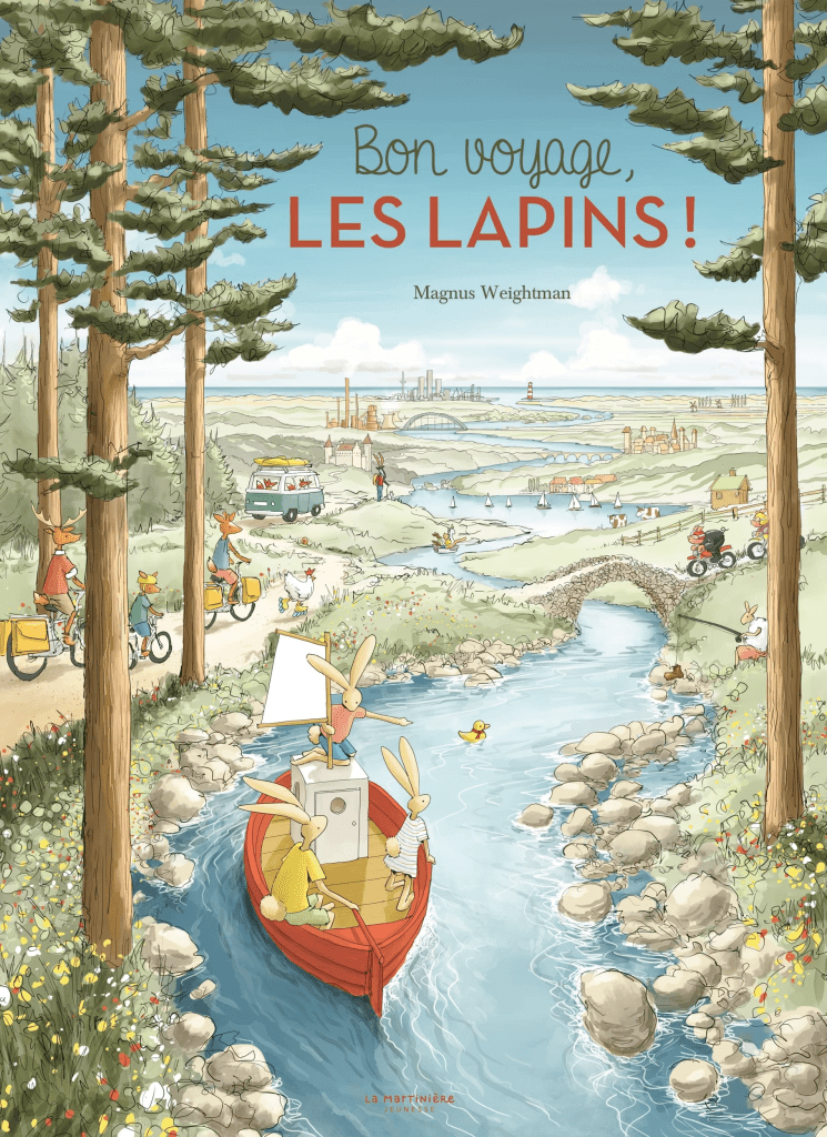 Après Bienvenue, Castor!, l’architecte et illustrateur Magnus Weightman embarque à nouveau le lecteur dans un immense cherche-et-trouve au fil de l’eau : Coin-Coin, le jouet préféré de Lapinette, est emporté par le courant. Vite, les Lapins se lancent à sa poursuite ! À bord de leur bateau, ils descendent le fleuve, depuis sa source dans les montagnes jusqu’à l’océan.