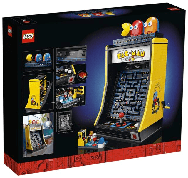 Une fonctionnalité lumineuse a été ajoutée pour éclairer la fente destinée aux pièces, et l’arrière de la borne s’ouvre pour révéler une petite scène avec une minifig de joueuse, à l’instar du set 10306 Atari 2600. De plus, un support est inclus, mettant en scène Pac-Man ainsi que les fantômes Blinky et Clyde, qui peuvent être exposés séparément ou placés en haut de la borne, et ils peuvent même être pivotés pour représenter les fantômes bleus.